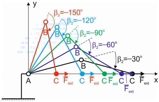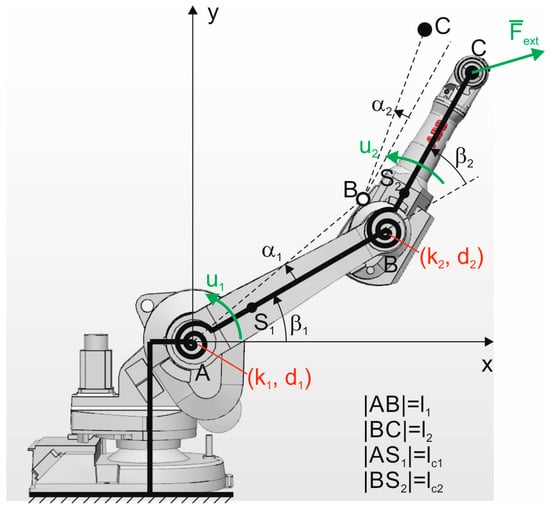 the values of the model parameters are given in Table 1. The method for their determination is given in the paper in [30]. Equation (24) takes into account the relationship between the vector of external forces applied to the robot end-effector and the moment of these forces acting on the robot’s links using the analytical Jacobian . Since the kinematic relationship between the coordinates of the robot end-effector (point C) and the angular coordinates is given by the system of equations