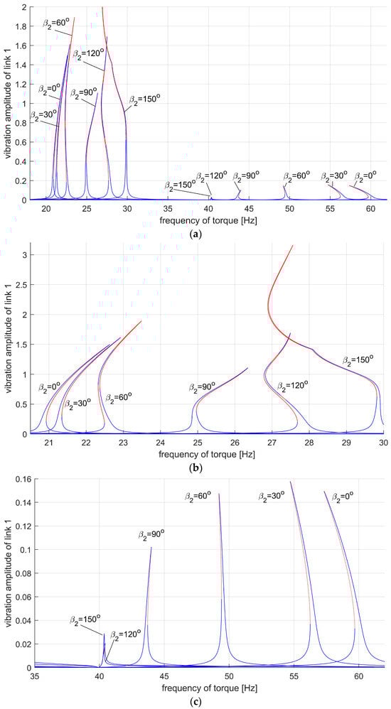 Amplitude–frequency characteristics as a function of configuration for the first link for different values of angle: (a) entire spectrum; (b) first resonance zone; (c) second resonance zone. The blue line indicates the area of stability, while the red line indicates the area of instability.