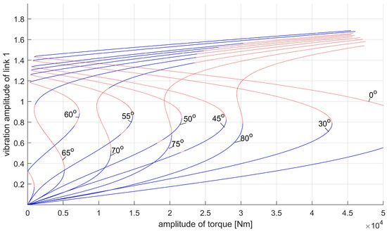 where —forcing amplitude for link 1; —forcing frequency for link 1. During the tests, the forced vibrations of the system were analysed at a variable forcing frequency in the range of Hz. As the direction of the change in the frequency value affects the behaviour of the system, tests were carried out for increasing and decreasing frequencies (so called forward and backward sweep). In this case, the vector of external forces is equal to 0. The tests were carried out for many arm configurations defined by the angle deg. The obtained amplitude–frequency characteristics of link 1 for selected positions of the robot arm are shown in Figure 4. Figure 4a shows the amplitude–frequency characteristics for the angle of 0 rad (0 deg), 0.5236 rad (30 deg), 1.0472 rad (60 deg), 1.5708 rad (90 deg), 2.0944 rad (120 deg) and 2.6180 rad (150 deg), with areas of instability marked by a red line. The graphs show that, similar to the natural frequencies in a linear system (Section 3), in a nonlinear system the resonance zones move closer together as the absolute value of angle increases. In addition, the phenomenon of the dependence of the vibration amplitude on the direction of the frequency change is visible, resulting in a slope of the characteristics in the resonance zones. For small angles, a stiff resonance curve is obtained around the first natural frequency (Figure 4b), which for large transits into a mixed softening–hardening curve. In contrast, for the resonance around the second natural frequency (Figure 4c), soft characteristics are obtained. As the angle increases, the situation changes: the curves shift towards lower frequencies and become stiff characteristics.