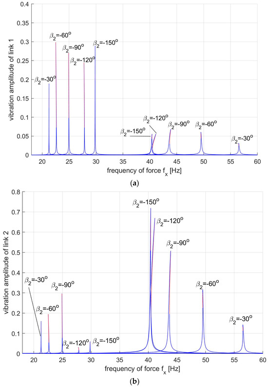 where —forcing amplitude in direction; —forcing frequency. During the tests, the forced vibrations of the system were analysed at a variable forcing frequency in the range of Hz. Despite the constant amplitude of the force, its effect depends on the position of the robot, because the moment of this force acting on the links depends on and . Moreover, it was assumed that the control input vector is equal to 0. The remaining conditions were the same as in the previously discussed simulation study. The simulation case discussed approximates the conditions of robotic machining of flat surfaces or edges, where the robot tip moves along a straight line. The harmonic force approximates the dynamic component of the cutting force acting on the robot.