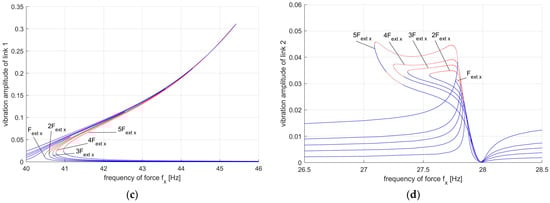Amplitude–frequency characteristics as a function of position of robot excited by an external force: (a) spectrum for link 1; (b) spectrum for link 2; (c) second resonance zone for link 1 for —the influence of force amplitude on the characteristics; (d) first resonance zone for link 2 for —the influence of force amplitude on the characteristics. The blue line indicates the area of stability, while the red line indicates the area of instability.