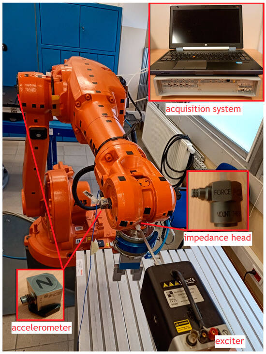 To verify the accuracy of the mathematical model, experimental tests were carried out using the test stand shown in Figure 8. The stand included the ABB IRB 1600 robot (ABB Ltd., Zürich, Switzerland), an electrodynamic exciter, an impedance head, a set of vibration sensors, an LMS Scadas mobile recorder (LMS International, Leuven, Belgium) and LMS Test.Xpress 5a software (LMS International, Leuven, Belgium). The tests used the functionality of the LMS Test.Xpress 5a software, which has the ability to control the exciter in a loop with feedback based on force measurement using an impedance head. A set of accelerometers attached to the manipulator joints (points B and C, Figure 6) was used to measure the vibrations of the robot. The acceleration signals were integrated twice to obtain the point displacements, and then the angular displacements of the links were calculated using the kinematics equations.