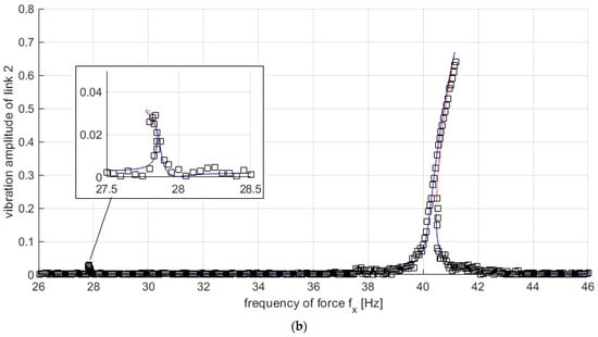 The tests were carried out in one of the robot positions shown in Figure 6, for deg. The excitation described by Equation (32) was used, where the excitation frequency was variable in the range 26–46 Hz in order to excite resonant vibrations in the robot in the two expected resonance zones. The characteristics obtained are shown in Figure 9. In order to compare the characteristics obtained, the results of the simulation (solid line) and the experiment (square markers) are shown simultaneously.