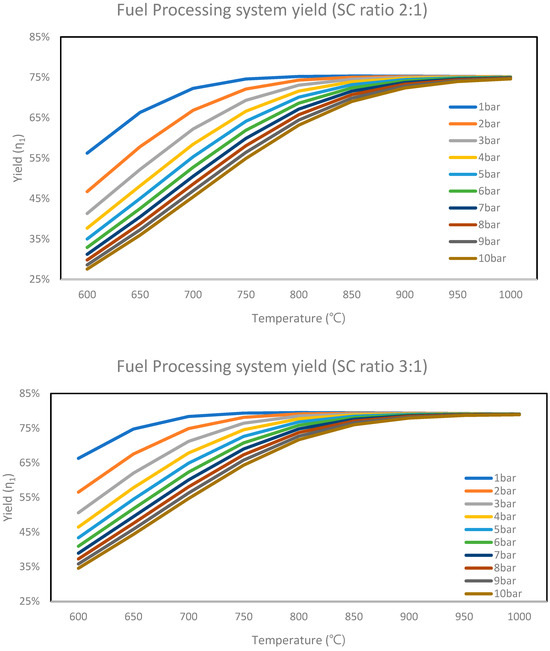 The overall system showed a maximum yield of about 43.17% at 1 atm and 800 °C. By adding compressor work to the yield of the existing fuel-processing system, the yield was reduced due to the process of pressurizing. Therefore, the highest efficiency was shown at 1 atm and 800 °C.