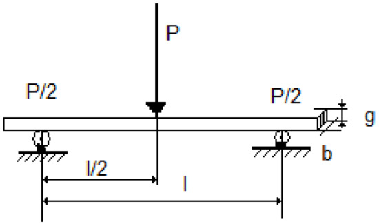where MOR (N/mm2) is the modulus of rupture; Pmax (N) is the maximum breaking force of the sample; l (mm) is the distance between supports; b (mm) is the width of the samples of each type of wood-based composite; g (mm) is the thickness of the samples. A schematic representation of the determination of modulus of rupture is presented in Figure 1.