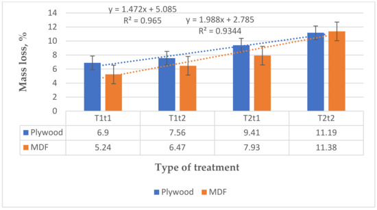 Another study [36] mentioned that there is good-quality adhesion between pieces of thermally modified wood when cold-setting melamine-urea-formaldehyde adhesive is used [36]. Further, Wang and its collaborators [41] shows the fact that the use of hot-setting melamine-urea-formaldehyde adhesive in the production of boards is important for increased air humidity conditions or outside applications. The variation in the torrefaction’s effects on depth is reduced, especially for samples with small thickness up to 20 mm [12,15]. Medium-density fiberboard has an advantage compared to timber, chipboard, and high-density fiberboard [14,22], because of its large and flat surface due to fine and uniform fibers.