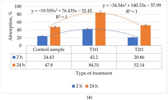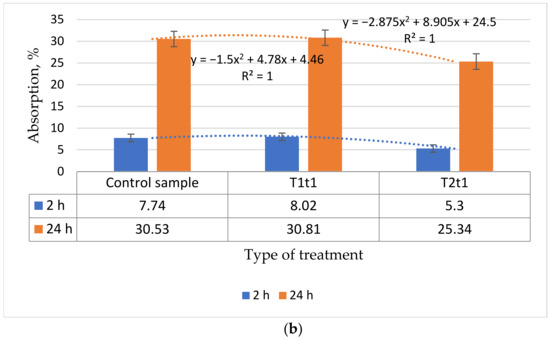 The water absorption percentage after 24 h was higher than the control sample for both regimes (T1t1 and T2t1) (with 76.79% and 9.07%, respectively). This evaluation was validated by the two polynomial curves, with the Pearson coefficient R2 =1 (see Figure 4a).