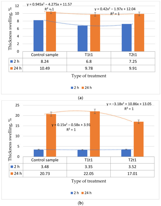 The thickness swelling of the treated MDF in the T1t1 regime after 2 h immersion in water was lower than the values recorded for the control sample (3.74%) and higher than the control sample for the treated MDF in the T2t1 regime (with 1.14%) (Figure 5b). For treated MDF in the T1t1 regime, the thickness swelling after 24 h immersion in water was higher than the recorded values for the control sample (with 6.36%) and lower for the treated MDF in the T2t1 regime (with 17.95%), as Figure 5b shows us.