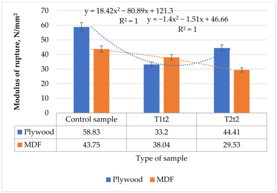 The gluing quality is one of the most effective factors related to modulus of rupture of poplar PW because the improper gluing of veneer sheets in plywood manufacturing can cause the delamination of layers, and such samples exhibit a low modulus of rupture value. The maximum modulus of rupture for the control sample of poplar PW was 70.06 N/mm2. This value falls within the limits obtained by other researchers (95.65 N/mm2 for poplar plywood and 117.37 N/mm2 in the case of MDF) [39,46]. The maximum modulus of rupture for torrefied poplar PW at 170 °C was 64.39 N/mm2, and 40.47 N/mm2 for torrefied poplar PW at 190 °C. The maximum modulus of rupture for the control MDF sample was 46.46 N/mm2, while the maximum modulus of rupture for torrefied MDF at 170 °C was 45.86 N/mm2, and for torrefied MDF at 190 °C, it was 31.27 N/mm2.
