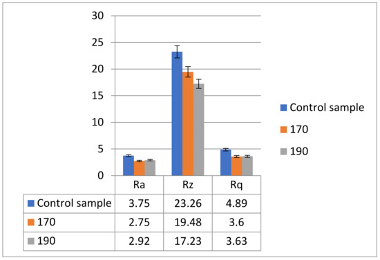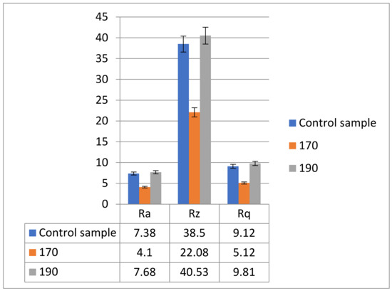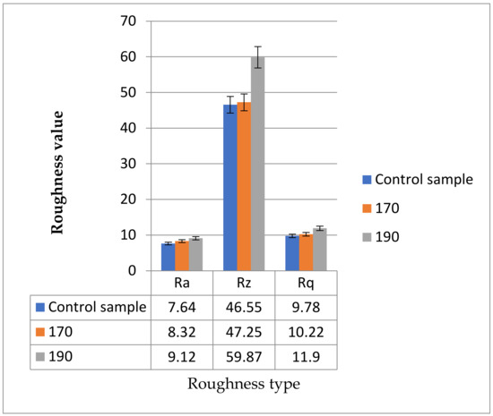 Roughness is an important parameter because it characterizes the quality of the processed surfaces. The main parameters of roughness characterization are Ra (arithmetic mean of irregularities), Rz (average height of irregularities), and Rq (mean square root). It is noted that regarding poplar PW parallel to fibers and MDF, the optimal regime of roughness is for the torrefaction of the samples at 170 °C (see Figure 7 and Figure 8). The surface quality of solid wood products is one of the most important properties influencing further manufacturing processes such as finishing or the strength of adhesive joint.