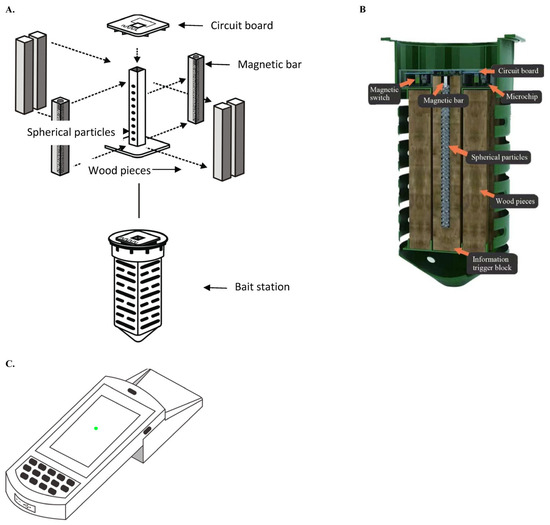 The device based on this method basically constitutes two parts: a bait station and a handheld scanner (reader) (Figure 1). The bait station includes an information trigger block at the bottom and an electromagnetic circuit board at the top (Figure 1A,B). The information trigger block consists of six rectangular wooden bars standing upright. Of the six bars, two have been hollowed inside to contain spherical glass particles (~1 mm in diameter). A permanent magnetic block is placed on the top of spherical glass particles in the hollow (Figure 1A,B).