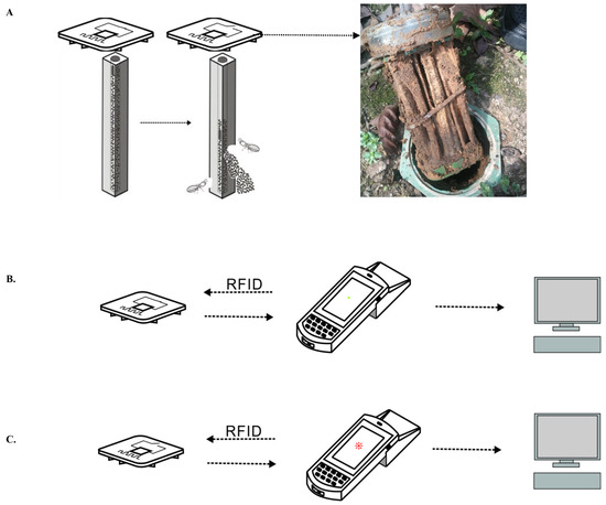 Scheme of how the system works. The magnetic bar drops while the wood piece in the information trigger block is consumed by termites, which causes a warning signal in the circuit board (A). The scanner sends a radio signal to the circuit board and the circuit board sends a signal back to the scanner based on radio frequency identification (RFID). The signal can be shown on the screen of the reader with green (no termites) (B) or red spots (with termites) (C).