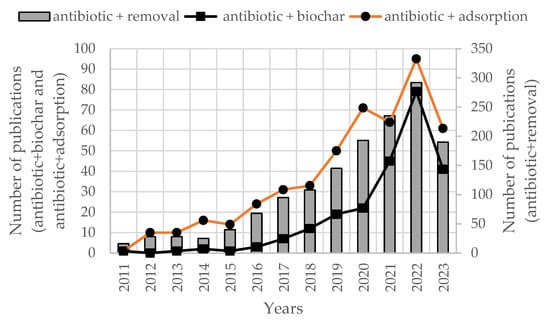 The adsorption of antibiotics with biochars is a major issue, especially in the last decade, considering the efficiency and cost advantage of biochars. The number of adsorption studies with the keywords “biochar” and “antibiotics” on the Web of Science has increased in the last eleven years, particularly after 2021, indicating the importance of the topic (Figure 1).