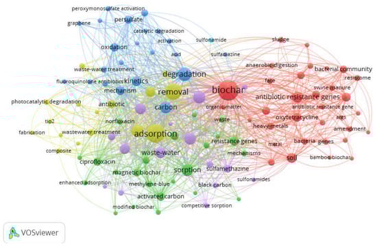 The most relevant research topics in biochar and adsorption studies can be visualized by using a co-occurrence network map [55] (Figure 2). In this figure, it can be seen that tetracycline, quinolone, and sulfonamide antibiotics were frequently studied for adsorption. Antibiotic resistance genes, removal of antibiotics by magnetic biochar and activated carbon, and advanced antibiotic removal methods such as photocatalytic degradation were trending research topics.