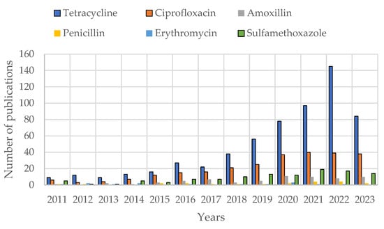 Number of publications with “adsorption” and “different antibiotics” titles on the Web of Science (WOS).