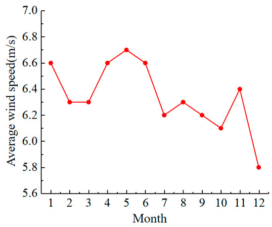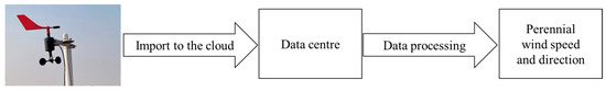 As shown in Figure 1, a meteorological instrument was arranged in the hinterland of the Tengger Desert, Zhongwei, Ningxia Province. The meteorological instrument was equipped with a three-cup anemometer and a wind vane to simultaneously monitor the wind speed and direction. The model of the three-cup anemometer was an HYDZ-FS01 series, which had a measuring range of 0–50 m/s, a frequency of 1 min/time, and a resolution of 0.2 m/s. The instantaneous wind speeds were uploaded to the cloud database in real time by using the meteorological instrument and downloaded to the terminal for data analysis. From January 2021, the wind speed and direction in the desert hinterland was monitored for a long period, providing guidance for long-term wind prevention and sand control in the desert hinterland.