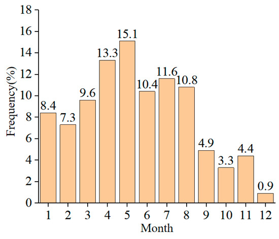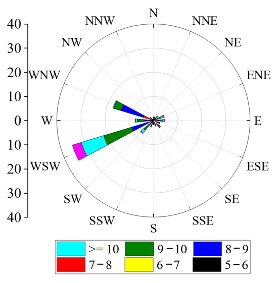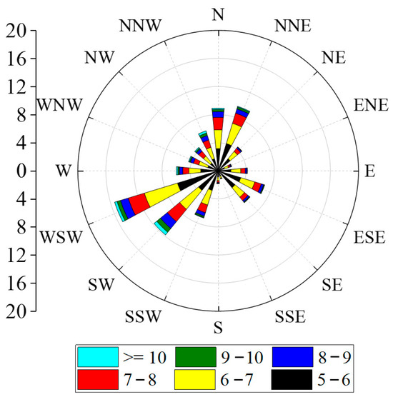When the wind speed exceeds the threshold velocity for particle movement, the sand is entrained into the air flow. Therefore, in order to intuitively study the movement of sand particles, only the high wind speed when the wind speed is higher than the sand moving wind speed (5.2 m/s) was studied. The monthly average wind speed in 2021 is shown in Figure 2, and the monthly average wind speed was higher than the sand. The frequency diagram of the starting wind speed is shown in Figure 3, and the wind direction rose diagram for the whole year of 2021 is shown in Figure 4. It can be seen in Figure 2, Figure 3 and Figure 4 that the average wind speed for the whole year was about 6.3 m/s, and the strong wind period mainly occurred from April to August. The reason is that it may be affected by the hot air flow, and the air flow rate becomes faster. The windy period in December was the shortest, only 0.9%. The main wind directions for the whole year were WSW and SW, followed by N and NNE. Therefore, not only should we maintain a single wind direction, with WSW and SW as the main directions, but the N and NNE directions also need to be maintained.