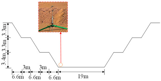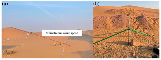 A 3D ultrasonic anemometer and stepped sand accumulator were used to monitor the wind-blown sand. The 3D ultrasonic anemometer model was a Gill Wind Master Pro, and the height was 1.5 m. It can measure the 3D fluctuating wind speed and wind direction within 0–65 m/s. The resolution was 0.01 m/s, and the frequency was 32 Hz. We used the QN-JSY sand accumulation instrument. The overall height was 100 cm. There were five rows of 10 sand inlet channels and sandbags. The sand inlet channel was 50 × 50 mm, and the channel spacing was 50 mm. The data acquisition system was a Campbell CR6 data collector, and the wind field data were transmitted to the mobile terminal by a USB data line. As shown in Figure 5, a sand sampler and an anemometer were arranged at the top of the dune and the edge of the road in the graded excavation section of the cutting section of the desert test base.