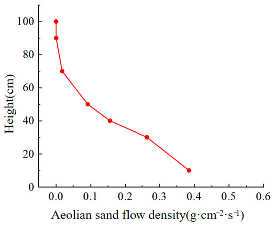 The sand collected by the sand accumulator in the desert hinterland was weighed and screened in the laboratory. The sand accumulated at the height of 100 cm from the ground for 24 h is shown in Table 1. The sand was divided into six particle size ranges: [0–0.075], [0.075–0.1], [0.1–0.25], [0.25–0.5], [0.5–1], and [>1]. The particle size distributions of the sand are shown in Table 2. Figure 8 shows a plot of the wind-blown sand density as a function of height.