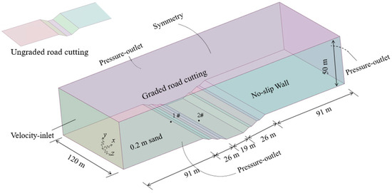 As shown in Figure 10, a velocity inlet was adopted on the left side of the CFD model. First, the measured fluctuating wind speed was decomposed along the x- and z-directions by 10 s. Using the linear difference method and the wind speed profile formula of Formula (4), the measured fluctuating wind speed was compiled as a user-defined function (UDF) and applied to the velocity inlet. From Section 3.2, it can be seen that most of the sand had particle sizes ranging from 0.075 to 0.25 mm, so the particle size of sand was set at 0.1 mm, a sand bed with a height of 0.2 m was set behind the velocity inlet to simulate the desert surface, and the particle size distribution of the sand particles was compiled into the UDF with reference to the measured values. The velocity variable of the transmission equation for the velocity inlet was set to the real-time pulsating wind speed. A press-outlet was adopted on the right side and left and right sides. The pressure variable of the transport equations for the pressure outlet was set to 0. Symmetry was adopted at the top, a no-slip wall was adopted at the desert surface and cutting, and the roughness height was 0.02 m.