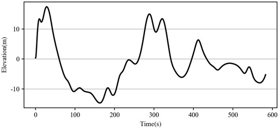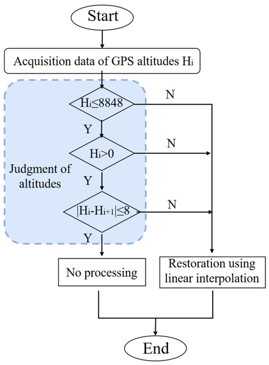As can be seen from Equation (2), GPS elevation and vehicle speed are important indicators for determining slope and in the actual data collection process, there may be cases of missing or abnormal data. In the case of missing or abnormal elevation data, the process shown in Figure 1 is used for elevation correction. For vehicle speed, when the vehicle is in the parking state (), its GPS elevation should remain unchanged, so its slope remains unchanged, and the slope of the current position is filled with a similar reasonable value. In the abnormal state of vehicle speed data, linear interpolation is used for the correction.