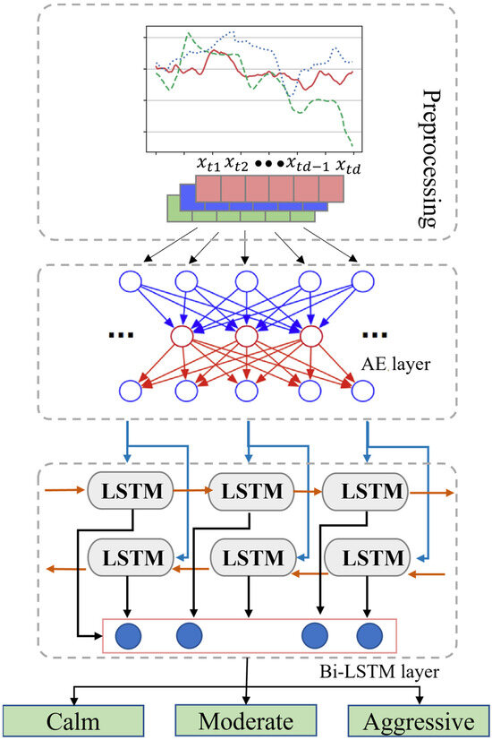 The combination of Bi-LSTM and a self-encoder is shown in Figure 2. The self-encoder compresses the data to low dimensions and later uses the compressed data as input, and the trained Bi-LSTM network learns the temporal dependencies between the sequence data points. In the training phase, the auto-encoder and Bi-LSTM networks are jointly trained, and this joint training process helps the model to learn a more informative and compact representation of the input data, which improves the performance of the driving style recognition task.