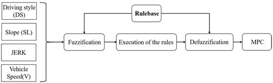 - A fuzzy inference logic was devised to adaptively modify the control weights of the objective function taking into account factors such as driving style, slope, acceleration change rate, and vehicle speed.