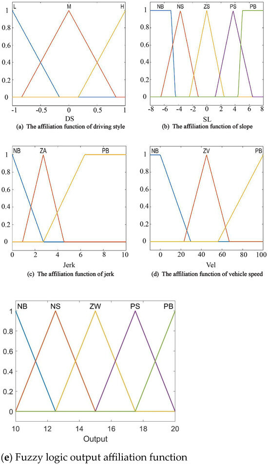 Combined with the input fuzzy control in this paper, represents driving style whose discrete domain is [−1, 0, 1], represents slope whose continuous domain is [−8, 8], Jerk represents rate of change in acceleration whose continuous domain is [0, 10], Vel represents vehicle speed whose continuous domain is [0, 100] and the continuous domain of the output variable is [10, 20].