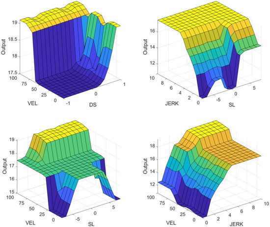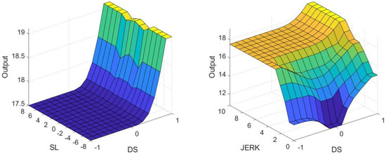 The rate of change in acceleration is most pronounced when the driver has an aggressive driving style and is more similar for different slope conditions. The driver’s output increases from 0 (Z) to positive (PB) in the acceleration rate of change domain when driving uphill or downhill, depending on their speed change, where a more conservative output is favorable if the slope is gentle. The effect of speed variation is more pronounced when the driver is a normal type of driving style. Drivers in this category usually have limited acceleration variation, i.e., they do not accelerate or decelerate as often, and are considered to be operating more steadily up and down hills, so their output is maximized only at high slopes, high speeds, and high rates of changes in acceleration. When the driver has a conservative driving style, in order to show the difference from a normal driver, it is assumed that he or she will adopt the most conservative operating strategy in the uphill and downhill conditions and will usually adopt a low speed and low change in acceleration strategy to pass, so the output usually varies from negative big (NB) to positive small (PS). Similar to the moderate driver, the maximum is only reached at high slope, high speeds, and high rates of changes in acceleration. Based on the above design of the fuzzy rules, a total of 135 fuzzy rules were designed and Figure 7 shows the design surface corresponding to the fuzzy rules.