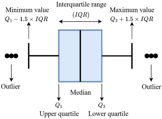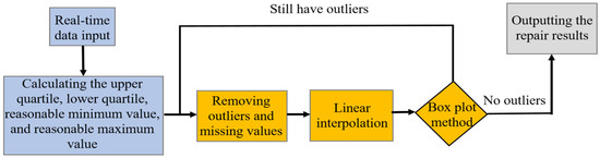 A box-and-whisker plot [38] is a graphical representation of a dataset that displays, in a compact and standardized manner, information about the location, dispersion, degree of dispersion, and crosstabulation of anomalous observations. Typically, a box plot as shown in Figure 9 consists of four parts: the median, the box, the tentacles extending from the box, and the outliers. The process of processing anomalous data using the box plot method is shown in Figure 10. Considering the continuity of the second data and their changing characteristics during the data acquisition process, it is highly reliable to use the linear interpolation method for data correction based on the elimination of outliers.