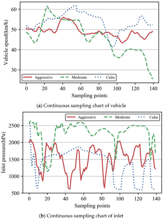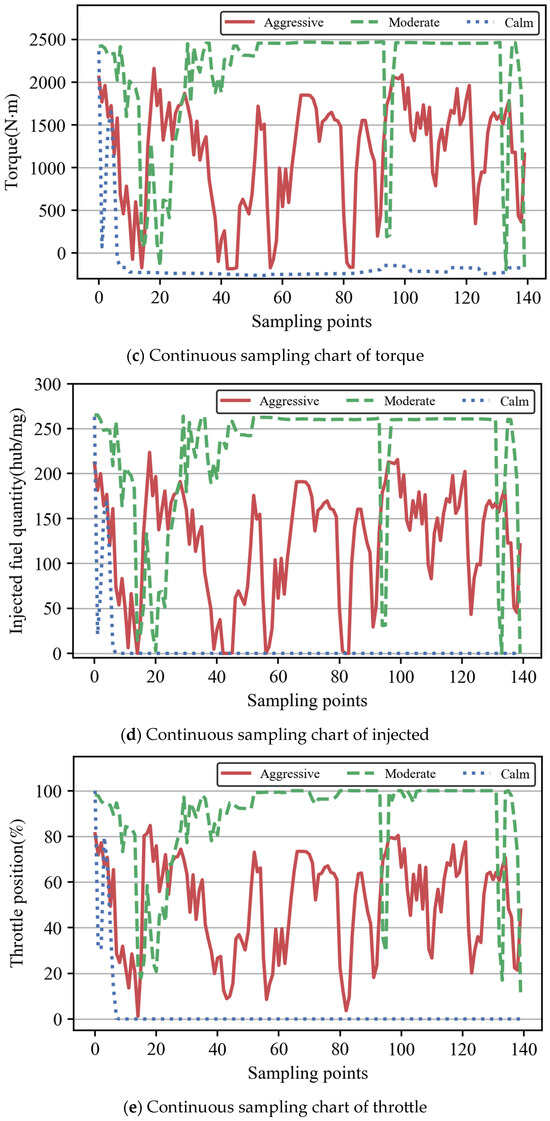 Three typical segments of the vehicle belonging to driver number 47 were selected with 140 consecutive sampling points to explore the differences between the driving styles. Considering the transfer characteristics of the data in the self-encoder-based Bi-LSTM, the driving style segmentation could not be continuously consistent, so the three selected typical segments were divided into aggressive, moderate, and calm driving styles, as shown in Figure 11.