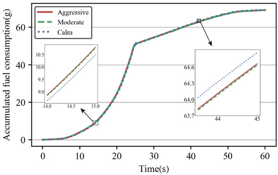 Figure 13 reflects the fuel consumption at a 5% slope. Overall, more fuel was consumed accelerating uphill than decelerating downhill, which is in line with reality. In the uphill phase, the aggressive driving style consumed more fuel more quickly as it needed to maintain a higher speed variation, whereas the calm driving style consumed less fuel as the speed on the uphill was closer to the desired speed and the speed variation was smoother.
