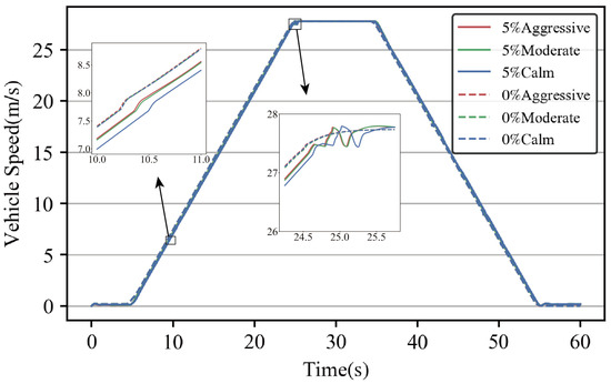 Considering both driving style and slope in the predictive control of the model can further reflect the interaction between the driver and the driving environment. In different driving environments, drivers will adjust their driving behavior in real time according to the changing environment and the influence of driving style will make some difference. Figure 15 shows the speed tracking of different driving styles on different slopes. It can be seen that during acceleration, acceleration was faster on flat ground (0% slope) and slower on longitudinal slopes. Similarly, during deceleration, the deceleration was smoother on flat ground. When a smooth speed was reached, the change in speed was smoother on the flat ground than on a 5% slope, with no jumps occurring. The distribution of driving styles is more similar on the flat ground, while on a 5% slope there is a clearer distinction, indicating that the influence of the driving environment on the driver’s handling of the vehicle should not be ignored.