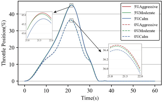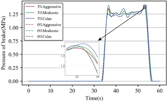 Figure 16 and Figure 17 show the variation curves of throttle opening and brake cylinder pressure corresponding to different slope and different driving styles. Combined with the graphs, it can be seen that the same speed control strategy can be achieved with a smaller throttle opening on flat ground, with less variation between driving styles. Similarly, for braking, the behavior of the different driving styles on flat ground tends to be similar and smoother with a 5% slope, and there was no jump in the braking process. In the case of a single driving environment, the influence of driving style on driving behavior is weaker, and the main influence comes from the change in speed.