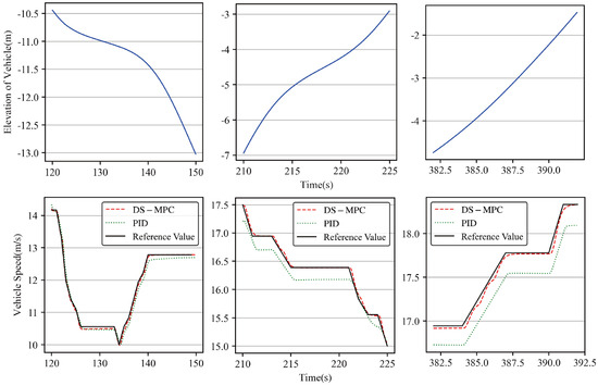 The elevation changes of the vehicle under actual operating conditions are depicted in Figure 22. To further illustrate the correlation between elevation changes and vehicle speed, Figure 23 presents typical slope sections along with their corresponding changes in vehicle speed. The proposed method outlined in this paper exhibits superior speed tracking performance on typical slope sections within the same road section. DS-MPC can enhance the precision of speed tracking during the deceleration process, thereby ensuring a uniform speed change. During the deceleration process, the vehicle has the ability to reach its predetermined target ahead of schedule and then enhance its acceleration. In comparison to PID control, it can achieve the desired vehicle speed in a shorter time. Furthermore, the DS-MPC algorithm is capable of effectively tracking the target speed during the deceleration phase, with a minimal overshoot and error, thereby achieving rapid tracking. It maintains good stability during the phase of increasing speed and further enhances the safety of road driving.
