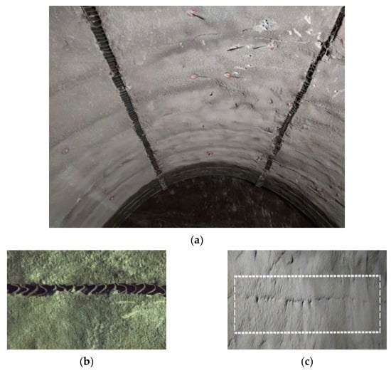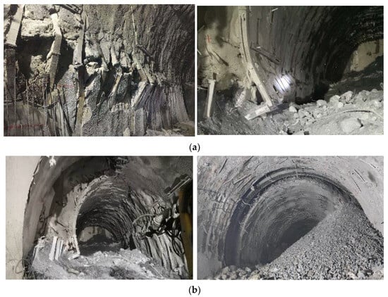 At present, the mainstream idea in tunnel engineering design in a weak surrounding rock remains the concept of “strong support and timely support”, which inhibits the deformation of the surrounding rock by providing strong structural support [2]. Support structures with high stiffness can tolerate small degrees of deformation, and because it is difficult to fully release the energy stored in the surrounding rock, such support structures require high strength. Engineering practice has shown that this type of support method often fails to effectively solve the problem of significant deformation of soft rock and can only be successfully managed after multiple cycles of supporting intervention, damage, and demolition [3]. However, this design method has generated many serious problems in addition to not being economical, which has impaired the progress of projects. It has also required greater construction safety measures and presented additional problems when dismantling failed supporting members, such as concrete cracking, falling, and collapsing blocks caused by the demolition of the tunnel arch, as shown in Figure 1 below.