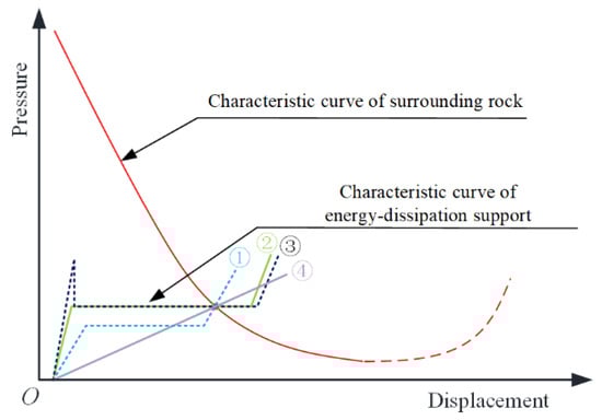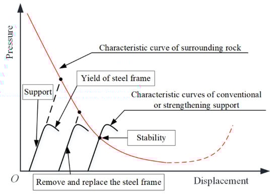 When constructing tunnels in soft surrounding rock, if the initial support of the tunnel should crack, the existing countermeasures primarily consist of installing an arch frame at the site of the support failure, removing the original support, and adopting the strengthening method. However, engineering practice has proved that the problem of cracking the supporting structure cannot be effectively solved by strengthening, which often involves multiple cycles of demolition and support measures. For example, in the cases of the Muzhailing Highway tunnel and Xinchengzi tunnel in China, it was necessary to adopt multiple arch modifications and to raise the support parameters to manage significant deformation. It nonetheless remained difficult to effectively solve the problem of damage to the supporting structure caused by large-scale deformation [21]. The objective of the repeated process of excavation and demolition cycles during construction is essentially to release the pressure of surrounding rock. This, however, also means being forced to accept the inevitability of the deformation of the surrounding rock. The stability of the supporting structure of the surrounding rock is dependent on the coordination between these two components, as shown in Figure 2 below. For this reason, merely relying on improving the strength of the supporting structure of tunnels in a high-energy geological environment is inadequate; hence, a new approach, method, and design are called for to achieve successful short- and long-term outcomes.