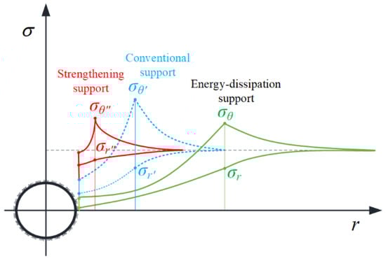 Compared to conventional support or enhanced support methods, the energy-dissipation support system was found to generate a certain degree of plastic deformation by controlling the surrounding rock, thus reducing the stress around the support and transferring the peak value of surrounding rock stress to a position farther away from the rock mass and the cavity, thus achieving a deep self-bearing effect, as shown in Figure 4, where is the stress of rock mass; r is the tunnel radius direction; is the tangential stress; and is the radial stress.