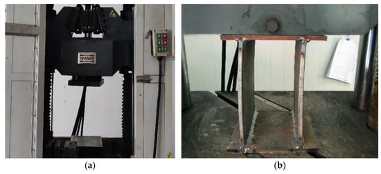 When constructing tunnels with an arch structure in large-scale deformation settings, the stress the supporting structure is subjected to mainly consists of deformation pressure, which relates to the principle of rigid loading [24]. To verify the performance of the steel plate composite materials in this study, a WEW-1000 universal testing machine was used to carry out the rigid compression testing. The compression test of the steel plate composite structure involved displacement loading at a loading rate of 5 mm/min. The loading device is shown in Figure 6.