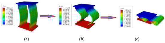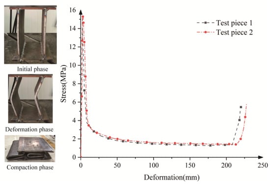 The deformation test of the steel plate composite structure is shown in Figure 7. It can be observed that the steel plate composite structure reached an initial peak of about 15 MPa, a constant resistance of about 2 MPa with a large stroke, and a compression of over 75%, which could fully dissipate the pressure of the surrounding rock. The initial peak value was able to prevent the large-scale deformation of the steel frame before the assembly was complete, which would have affected the assembly. Because the supporting structures of tunnels with an arch structure in large-scale deformation settings are mainly subjected to deformation pressure, which belongs to the principle of rigid loading, the application of steel plate composite structures to the construction of tunnels in soil prone to large-scale deformation was found not to produce instability [18]. It proved possible to solve the safety problem of large deformation tunnels by using a yielding structure. The steel plate composite structure was set on the steel frame so that the original rigid structure was transformed into a yielding structure so that the steel frame showed no signs of buckling or other damage in the deformation process.
