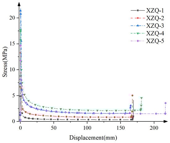 The stress–deformation curves of the steel plate composite structure under five working conditions are shown in Figure 10. Based on the validation test results, the working period of the steel plate composite structure can be divided into four main stages. The first stage is the elastic deformation stage, characterized by a linear increase in pressure with deformation. The second stage is the yielding down deformation stage, where the pressure decreases with deformation. The third stage is the yielding constant resistance deformation stage, where the pressure remains constant with deformation. This stage is considered the primary working stage for steel plate composite structure deformation, as it exhibits a significant stroke under constant pressure. The fourth stage is the compaction deformation stage, where the pressure sharply increases with deformation. It can be observed that while the initial peak value and constant resistance value of the vertical steel plate increased with the increase in thickness of the steel plate, the initial peak value and constant resistance decreased with the increase in height.