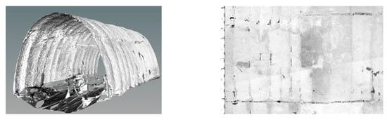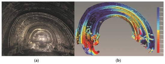 It was essential, when designing the steel plate composite structure, to consider the characteristics of the project itself, and it was deemed necessary to employ a 3D laser scanner to assist with the design. This was used to monitor the holographic geometric parameters, which could, in turn, determine the deformation distribution values along the tunnel circumference, provide quantitative feedback for the reserved design to address the deformation, predict the deformation trend, and evaluate safety risks. Three-dimensional laser scanning has proved beneficial in improving construction quality, controlling construction costs, and ensuring on-site safety [27]. The scanned point cloud is shown in Figure 11 above. The most interesting section of data extracted from the 3D cloud map is shown in Figure 13. The left-side deformation is significantly higher than the right-side deformation, and there is a clear bias situation. As previously indicated, the original support design had failed to solve the problem of large-scale deformation, and once the overall structure had been damaged, the deformation magnitude increased sharply, presenting a risk of collapse of the tunnel, which severely augmented the site safety risks for personnel and machinery.