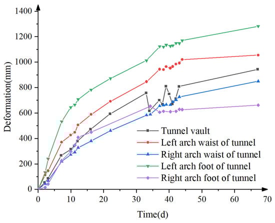 To study the construction deformation of the energy-dissipation support, the aforementioned 3D laser scanning system was used to monitor the holographic deformation of the initial support, with the corresponding monitoring grayscale diagram shown in Figure 16. Limited by space, the section with the largest deformation was selected for analysis, and the support time-displacement curve of key points was drawn, as shown in Figure 17.
