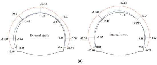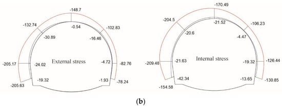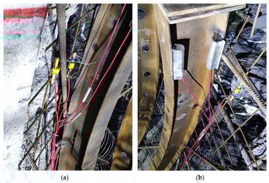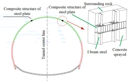 - According to the 3D laser scanning monitoring results, the top and bottom steel plates of the steel plate composite structure have a thickness of 1 cm, and the height of the vertical plate is 28 cm with a thickness of 8 mm. The ring structure was installed at the initial support arch waist position to form a pressure support. The on-site monitoring results showed that (a) there was no cracking of the support structure and no concrete block falling; (b) the maximum stress of the sprayed concrete was 21.01 MPa and the maximum stress of the steel frame was 209.48 MPa, which were less than the design strength, which indicated that the support structure had a high safety coefficient; and (c) there were no safety accidents, which demonstrated that, in ensuring the safety of the construction site, the problem of initial support failure of tunnels in soft and weak surrounding rocks.