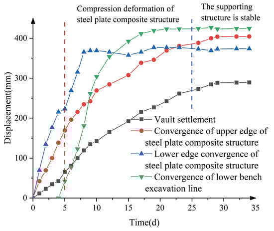 It can be seen from Figure 15 that the supporting deformation rate is relatively large from 0 to 10 days. With the deformation of the steel plate composite structure, the deformation rate of the support decreases gradually and eventually stabilizes after 25 days. Lastly, the deformation of the vault was 289.25 mm; that of the upper border of the steel plate composite structure was 404.38 mm; and that of the lower border of the same was 373.76 mm. The convergence deformation of the lower bench excavation line was 424.55 mm.