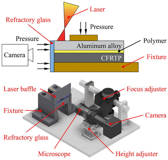 To observe the interfacial bonding process during laser direct joining of CFRTP composite with aluminum alloy, an online observation experimental device as shown in Figure 1 was designed. Principle of observation of interfacial bonding process: Firstly, the polished end faces of the CFRTP composite and the aluminum alloy were pressed onto a refractory glass, thus equating them to the confined material interface during laser direct joining; subsequently, a laser was used to irradiate the aluminum alloy close to the refractory glass, and a camera with a microscope was used to observe the interfacial bonding process through the refractory glass. The observation device consisted of the fixture, refractory glass, microscope, camera, focus adjuster, height adjuster, and laser baffle. The camera with microscope had a spatial resolution of 1.23 μm/pixel and a frame rate of about 40 Hz, satisfying the observation requirements of the interfacial bonding process. To accurately observe the interfacial bonding process, thermal insulation was made at the contact area between the fixture and the materials.