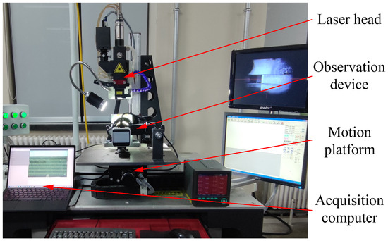 The experimental materials were carbon fiber reinforced polyether-ether-ether-ketone (CF/PEEK) thermoplastic composite, 6061 aluminum alloy, and polyether-ether-ether-ketone (PEEK) polymer, which have been used in aviation and other fields. The lengths and widths were 100 mm × 25 mm, and the thicknesses were 2 mm, 3 mm, and 0.25 mm, respectively. The mechanical and thermal properties of the experimental materials are shown in Table 1. The CFRTP composite consisted of 16 plies alternating at 0° and 90°, and its fiber volume fraction was 60%. As shown in Figure 2, the laser direct joining experimental device consisted of a laser head, motion platform, observation device, and acquisition computer. Since the quality of the end faces of the materials directly determines the effect of observation, 120#, 400#, 1000#, and 3000# sandpapers were used to polish the end faces of the CFRTP composite and aluminum alloy until the end faces were smooth and without obvious scratches. Once the materials were prefixed to the fixture, it was necessary to apply pressure on the refractory glass. After ensuring that the polished end faces of the materials were in close contact with the refractory glass, the materials were clamped under the same torque using a torque wrench, and the observing position was adjusted to the center of the interface using the height and focus adjusters. Finally, to prevent the laser scattering from affecting the observation effect, the laser baffle was attached to the fixture.
