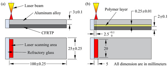 Because of the high fiber volume fraction of the CFRTP composite, insufficient polymer matrix may lead to poor interfacial bonding during laser direct joining, and filling the polymer layer at the interface between the CFRTP composite and the aluminum alloy is a common solution [33]. To this end, laser direct joining experiments with and without polymer layer filling were performed as shown in Figure 3. In the experiments, a fiber laser with a wavelength of 1064 nm was used to scan the aluminum alloy surface reciprocally six times. The laser beam was in defocused state; the defocusing distance was 80 mm, the corresponding spot diameter was 5 mm, the maximum laser power was 1000 W, and the maximum laser energy density was about 5 × 103 W/cm2. For both cases, the scanning speed of the laser was 10 mm/s, the single scanning length was 20 mm, and the center of the laser spot was 2.5 mm from the edge of the aluminum alloy. When there was no filled polymer layer, the laser powers were 400 W, 500 W, and 600 W, whereas the laser powers were 500 W, 600 W, and 700 W when the interface was filled with polymer layer, because the polymer has a high specific heat capacity and low thermal conductivity.
