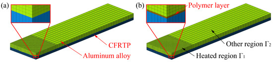 To simulate the temperature field during laser direct joining, the geometrical models shown in Figure 4 were established for the interface with and without polymer layer filling, respectively, and the material dimensions were the same as those in Section 2.1. To balance the computational accuracy and efficiency, two sizes of grids were chosen for meshing. Since the temperature gradient in the heated region Γ1 irradiated by the laser was high, a fine hexahedron with a size of 0.625 mm was used for meshing parallel to the thickness direction. The other region, Γ2, which had a low temperature gradient, was meshed with a coarse hexahedral of size 2.5 mm, and wedges were used for the transition between the two regions. In the material thickness direction, aluminum alloy was meshed using 0.5 mm, and the polymer layer was meshed using 0.25 mm. Considering the anisotropy and ply structure of the CFRTP composite, it was meshed using ply thickness of 0.125 mm.