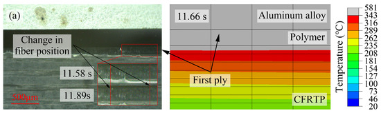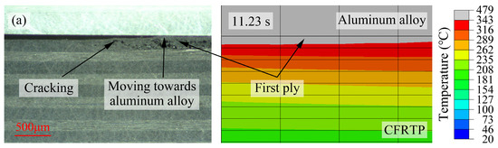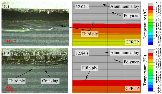 The observed results and corresponding temperature distributions after filling the polymer layer at the interface are shown in Figure 6. The molten polymer layer filled the gap between the end face of the material and the refractory glass, leading to a more pronounced color change compared with the melting. However, this did not mean that melting of the polymer matrix occurred, and it was still necessary to use the position change of the fibers or cracking between the matrix and fibers as the melting criterion. Due to the lower thermal conductivity of the polymer than the CFRTP composite, the number of melted plies was lower under the same laser power. When the laser power was 500 W, cracking was not observed in Figure 6a, but the observations at 11.58 s and 11.89 s showed that the position of the fibers in the first ply changed, indicating that the polymer layer was completely melted and the first ply was partially melted, which was consistent with the simulation. With similar criterion, it was found that the number of melted plies in the CFRTP composite increased to three plies when the laser power was 600 W, and it was accompanied by thermal decomposition in the molten polymer layer. When the laser power was 700 W, the number of melted plies in the CFRTP composite was still observed to be three plies, which was different from the simulation result of five plies, because bubbles in molten polymer induced by the thermal decomposition hindered the heat transfer. The above results proved that the temperature distribution during laser direct joining was correlated with the melting of the polymer matrix and the interfacial filled polymer.